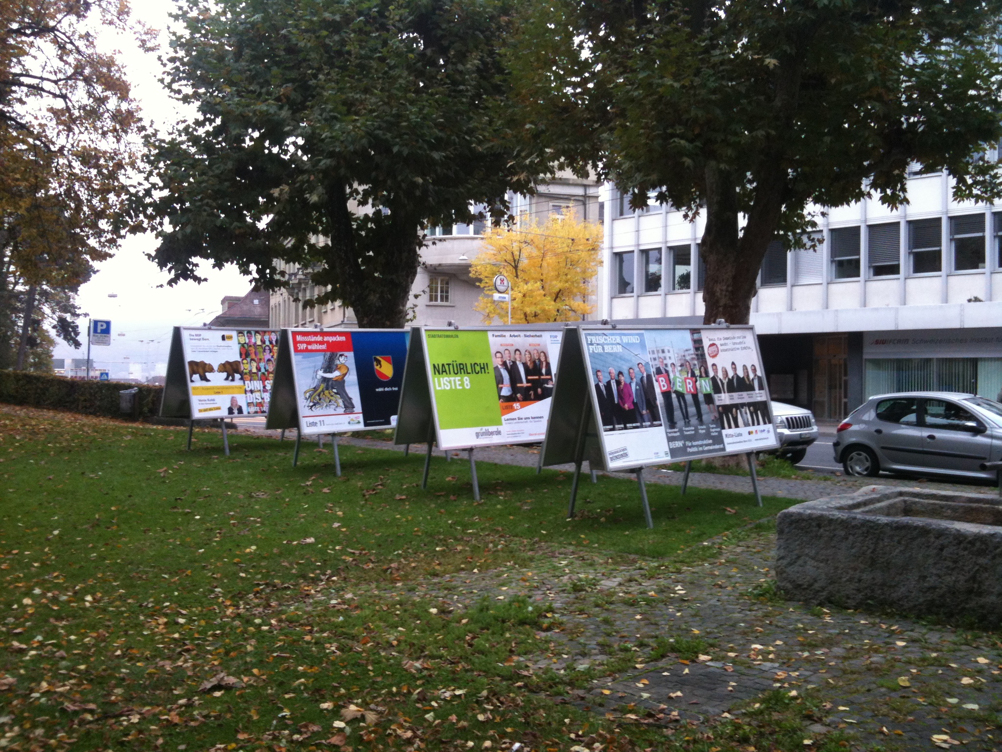 Cam asa arata afisajul stradal prin Elvetia. Panourile apar si dispar odata cu campania electorala. In rest afisaje in locurile publicitare si flyere prin posta. Nu tu lipeli pe garduri, nu tu lipeli peste afisul altuia.